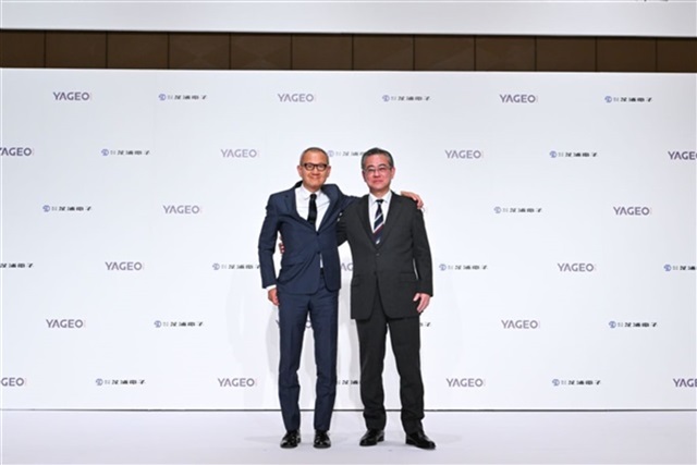 Yageo chairman Pierre Chen and Shibaura Electronics president Akira Kasai shake hands during a joint press conference in Tokyo. Credit: Yageo